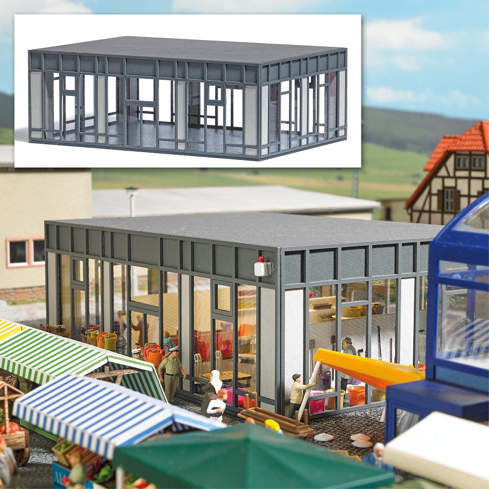 GlashalleDas Vorbild dieses modernen Gebäudes befindet sich als Anbau des Bahnhofes Bad Bentheim in Niedersachsen und beherbergt im Original die Bahnhofsgastronomie. Somit ist es die ideale Ergänzung zum Busch-Modell des Bahnhofes Bad Bentheim (H0 1661). Aufgrund seiner rundum verglasten Bauweise mit den großen Fensterfronten ist das Gebäudemodell aber auch freistehend und sehr vielseitig einsetzbar, z.B. als Kunstpavillon, Ausstellungshalle, Fahrzeughalle, Fitnessstudio, Bürgerhaus, Tourist-Information und vieles mehr. Inkl. Ausschneidebogen mit verschiedenen Inneneinrichtungen. Beleuchtbar mit Busch LEDs 5998.Größe: 160 x 110 mm, Höhe: 56 mm.
