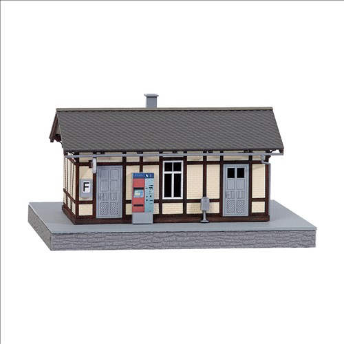 Haltepunkt AufhausenNachbildung eines kompakten und attraktiven Haltepunktes nach einem Vorbild bei Bopfingen/Baden-Württemberg. Fachwerk in Echtholz bereits farbig gebeizt. Mit Uhr, Fernsprechkasten, Abfallkorb und Fahrkartenautomat. Bausatz. Größe Gebäude: 93 x 68 mm, 53 mm hoch. Größe Bahnsteig (Grundplatte): 190 x 100 mm, 10 mm hoch.