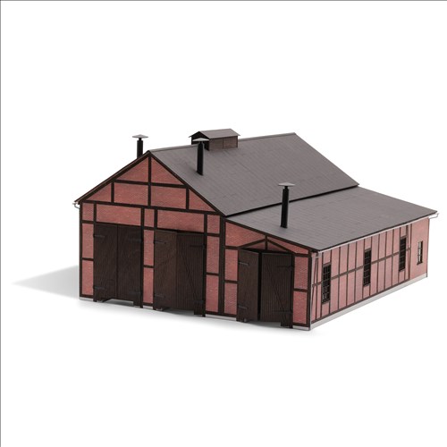 Dreiständiger Lokschuppen mit gealtertem Mauerwerk. Fachwerk und Tore (zum Öffnen) aus echtem Holz. Beleuchtbar mit Busch LEDs 5998. Bausatz.Größe: 312 x 255 mm, 160 mm hoch. Standlänge 235 mm. Durchfahrtshöhen: 59 mm und 69 mm. Durchfahrtsbreite: 47 mm.