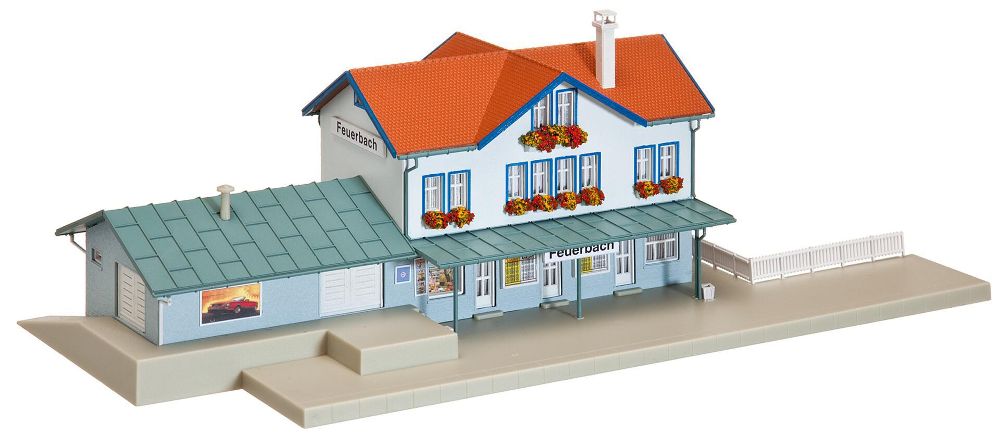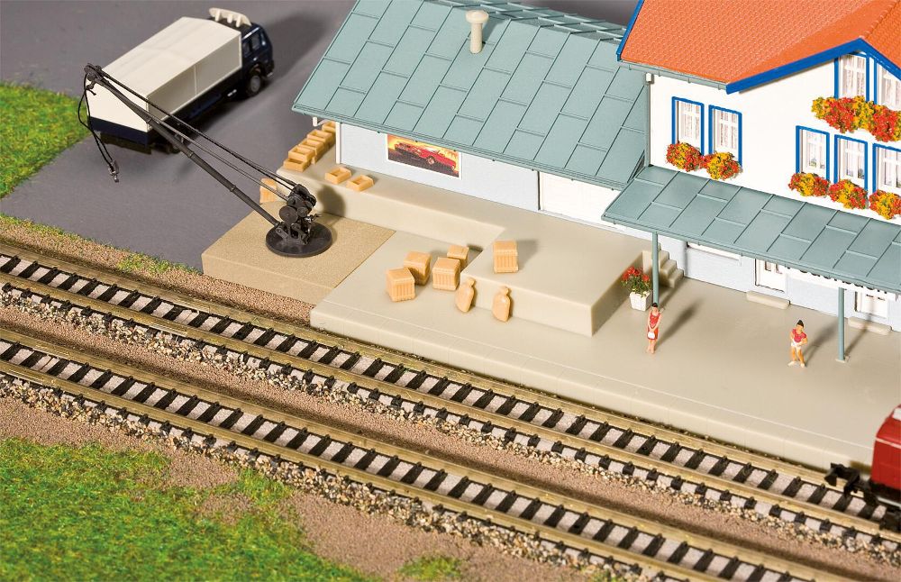 Kleinstadtbahnhof mit angebautem Güterschuppen und überdachtem Bahnsteig. Dazu passen die Bahnsteige Art. 222124 und Art. 222125.