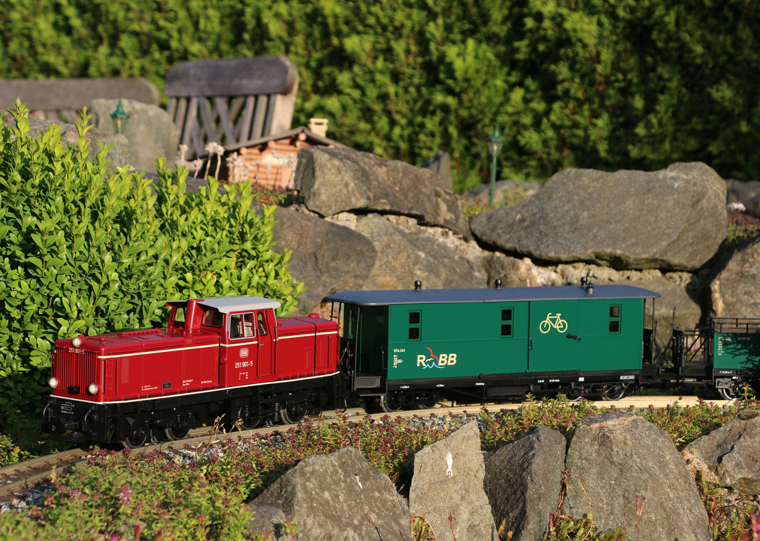 Diesellokomotive BR 251. Diese Maschine wurde ursprünglich im August 1964 bei der DB für 750 mm Schmalspur in Betrieb genommen. Aktuell ist die Maschine in Putbus auf Rügen bei der RüBB. Diese Lok hat ein neues Farbkleid in altroter Farbe bekommen mit einer Beschriftung um 1968. Achsfolge B´B´. Ausgerüstet mit einem mfx/DCC-Decoder mit vielen Licht- und Soundfunktionen. Energiespeicher eingebaut. Alle Achsen angetrieben. Haftreifen. In Fahrtrichtung wechselnde Beleuchtung, Führerstandsbeleuchtung, Führerstandstüren zum Öffnen.Länge über Puffer 43,6 cm.