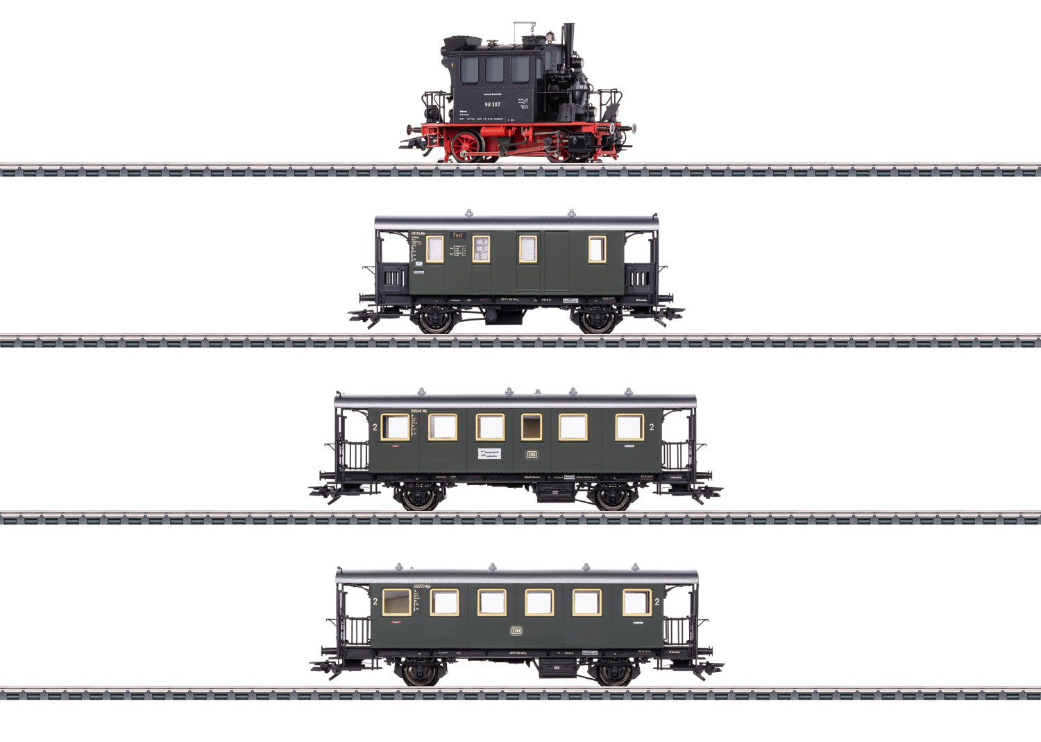 Vorbild: Baureihe 98.3 Glaskasten (ehem. bayerische PtL 2/2) mit Blindwelle und Dreilicht-Spitzensignal und drei Lokalbahnwagen bayerischer Bauart der Deutschen Bundesbahn (DB). Ein Gepäck- und Postwagen und zwei Personenwagen 3. Klasse. Im Betriebszustand der Epoche III um 1957.