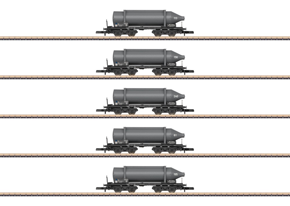 Vorbild: 5 Carbid-Flaschenwagen. Privatwagen der SKW Trostberg AG eingestellt bei der Deutschen Bundesbahn (DB). Alle Wagen im Zustand der Epoche IV.