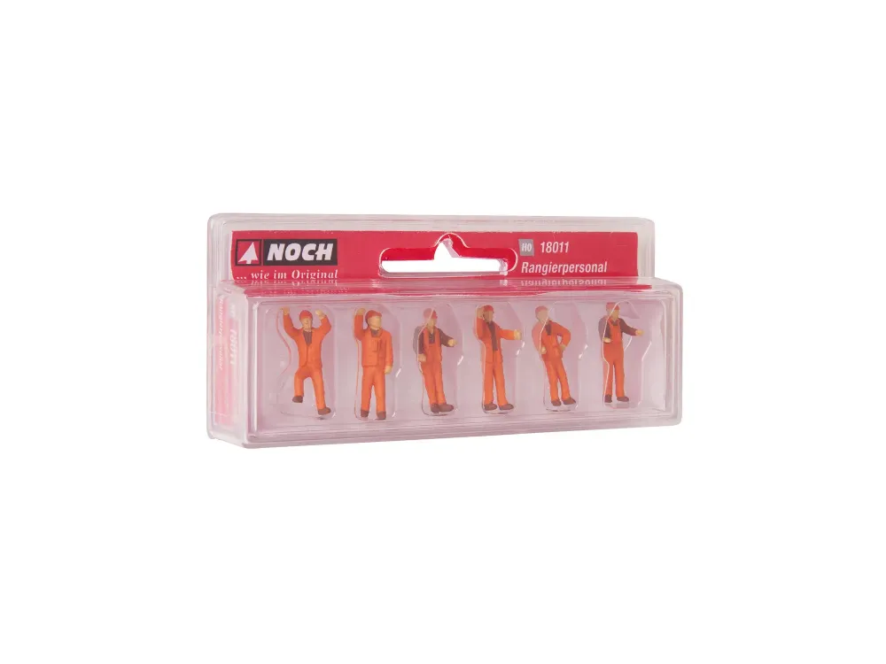 Vorsicht vor den einfahrenden Zügen Einfach bemalt zum günstigen Preis! Ab sofort gibt es die NOCH Figuren „Rangierpersonal“ auch in der Spurweite H0 als Hobby-Figuren. Das Set beinhaltet Modellfiguren im Maßstab 1:87. Das Rangierpersonal trägt orangefarbene Arbeitskleidung mit Leuchtstreifen, damit sie beim Arbeiten an den Gleisen nicht übersehen werden und auch bei Dunkelheit erkennbar sind. Außerdem haben alle Arbeiter zum Schutz einen Helm auf dem Kopf. Die Arbeiter rund um die Gleise dürfen auch auf der Modellbahnanlage nicht fehlen. Am Bahnhof herrscht immer reges Treiben und deshalb gibt es nun auch das Rangierpersonal nun auch für alle Hobby-Freunde. Die Hobby-Figuren sind einfacher bemalt als die „normalen“ NOCH Figuren. Daher sind die Hobby-Figuren die erste Wahl, wenn es darum geht Plätze, Dörfer, Städte, Bahnsteige, Parks, Felder, Waggons und vieles mehr preisgünstig zu bevölkern. Die besonders preiswerten NOCH Hobby-Figuren erkennen Sie an der roten Verpackung.