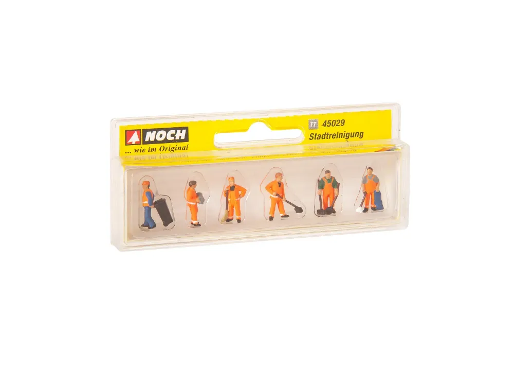 Straßenreiniger bei der Arbeit Das Set enthält sechs Straßenreiniger im Einsatz. Die sechs handbemalten Figuren im Set führen verschiedene Tätigkeiten aus. Vier Figuren kümmern sich um das Säubern von öffentlichen Straßen und Wegen sowie Plätzen und Parkanlagen. Zwei Figuren leeren Abfallbehälter und entsorgen den Abfall fachgerecht. Die realistisch handbemalten Modellfiguren sind im Maßstab 1:120 (Spur TT, ca. 1,5 cm hoch) ausgeführt und perfekt für die Dekoration von Modellbahnanlagen und für die Ausgestaltung von Dioramen geeignet.