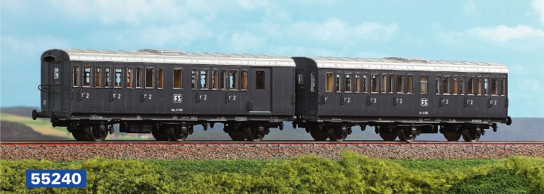 AC55240 Set von zwei dreiachsigen Wagen des Typs 1931R, die aus einem Biy 34.000 - Wagen und einem BDiy 67.000 - Wagen bestehen, beide in grey Ardesia Lakierung ab Ende des Dienstes.