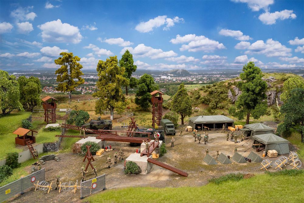 Achtung, stillgestanden! Staub wirbelt durch die Luft, als 7 trainierte Miniatur-Soldaten in Uniform (im Set enthalten) über den Truppenübungsplatz preschen. Vorbei an allerlei Trainingsgeräten, zwei Aussichtstürmen in Holzoptik und einer überdachten Plattform, vorbei an vier Einpersonenzelten und weiterem Zubehör wie Stacheldrahtzäunen. Drei große Lagerzelte in typischem Militärgrün runden die Szenerie ab. Dieses Set ist perfekt geeignet, um die Militär-Miniaturanlage mit mehr Details zu verschönern. _x000D_Inhalt: Lagerzelte (3 x), Einpersonenzelte (4 x), Stacheldrahtzäune (7 x), Aussichtstürme (2 x), überdachte Plattform, Trainingsgeräte, Leitern, 7 Miniatur-Soldaten_x000D_