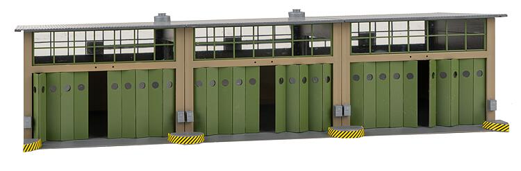 3-ständige Reparaturhalle mit offen oder geschlossen darstellbaren Falttoren und rückwärtigen Belüftungsventilatoren. Für eine Erweiterung der Halle können mehrere Exemplare des Modells nebeneinander gebaut werden.