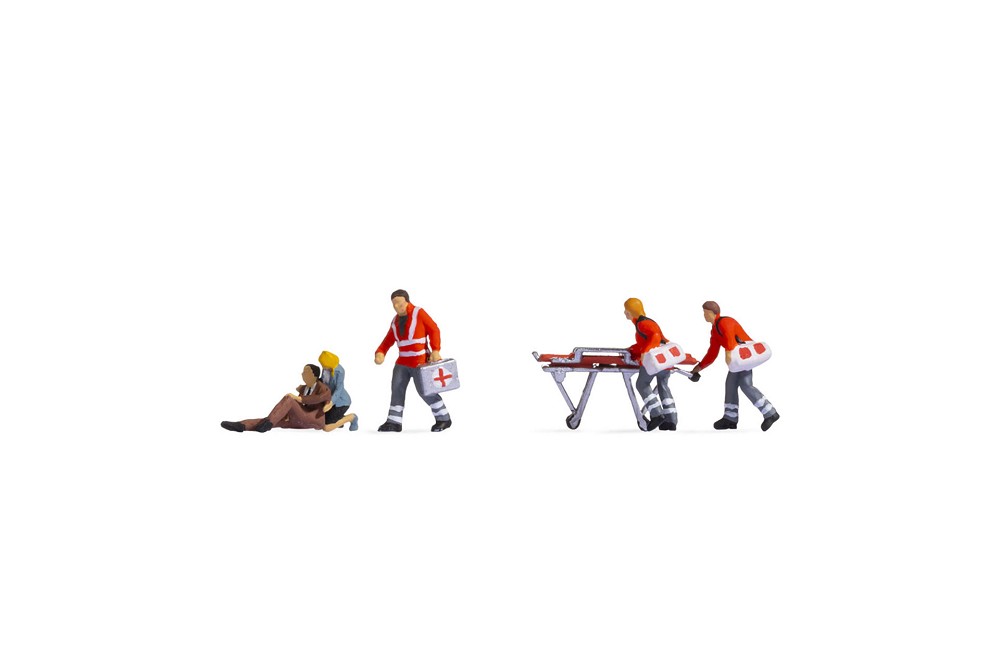 Rettungseinsatz im Straßenverkehr! Im Figuren-Set "Verkehrsunfall" für die Spurweite TT sind sechs Figuren und eine Rettungstrage enthalten. Während zwei Sanitäter mit Arzttaschen um die Schulter die Rettungstrage zum Verletzten schieben, sitzt der Patient mit einem angewinkelten Bein auf dem Boden. Hinter ihm kniet eine Passantin und leistet Erste Hilfe. Ein Notarzt mit Koffer macht sich ebenfalls auf den Weg zum Betroffenen. Mit den Figuren sorgen Sie für Realität auf Ihrer Modelllandschaft und können diese detailliert sowie mit allen Facetten der Wirklichkeit ausgestalten