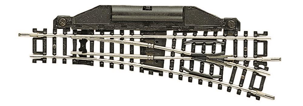 Weiche rechts für Handbetrieb.Länge 112,6 mm, Abzweigwinkel 15°, Abzweigradius 362,6 mm (entspricht R5).
