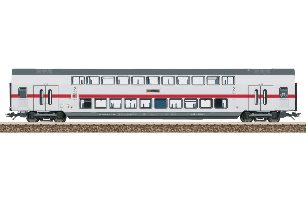 Modell: Befahrbarer Mindestradius 360 mm. Mit Hoch-Einstieg über den Drehgestellen. Serienmäßig mit eingebauter LED-Innenbeleuchtung auf beiden Ebenen und stromführenden, trennbaren Kurzkupplungen. Beleuchtete längsseitige Zugzielanzeigen. Innenbeleuchtung funktioniert nur im Verbund mit dem Doppelstock-Steuerwagen und kann über einen Decoder im Steuerwagen digital ein- und ausgeschaltet werden. Dazu ist eine definierte Fahrzeugreihenfolge vorgegeben. Stirnseitig rot transparente Schlusslicht-Einsätze an den Wagenenden. Vorbildgerechte Drehgestelle der Bauart Görlitz, mit angesetzten Klapptrittstufen. Länge über Puffer 28,6 cm.